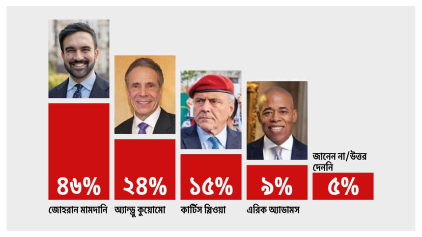 গত মঙ্গলবার প্রকাশিত দ্য নিউইয়র্ক টাইমস ও সিয়েনার যৌথ জরিপে দেখা যায়—জোহরান মামদানির পক্ষে মত দিয়েছেন ৪৬ শতাংশ, অ্যান্ড্রু কুয়োমোর পক্ষে ২৪ শতাংশ, কার্টিস স্লিওয়ার পক্ষে ১৯ ও এরিক অ্যাডামসের পক্ষে নয় শতাংশ ভোটার।