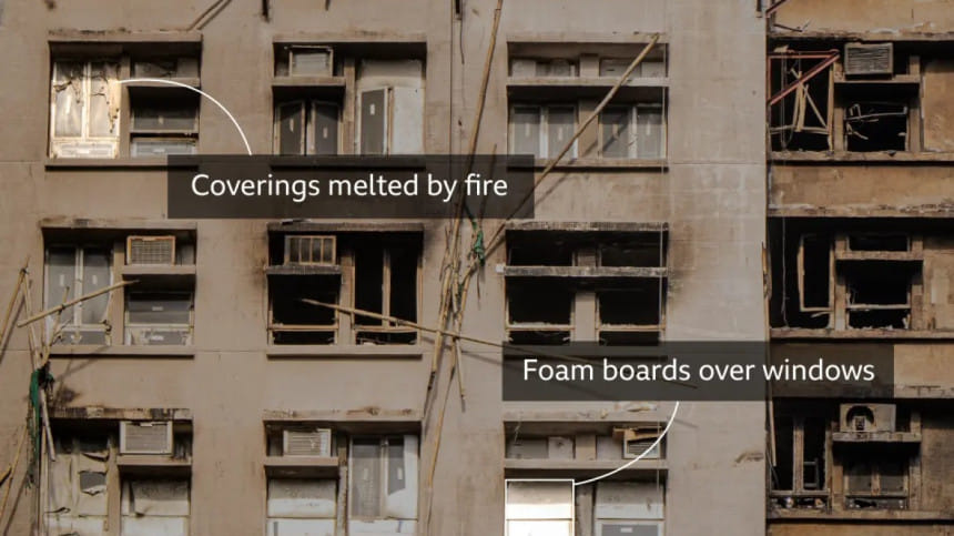 সংস্কারের সময় ক্ষতি থেকে বাঁচাতে ভবনের জানালাগুলোতে স্টাইরোফোমের প্যানেল লাগানো হয়েছিল বলে মনে হচ্ছে।