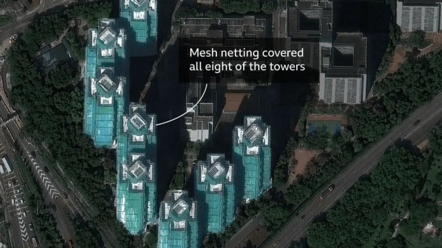 অগ্নিকাণ্ডের আগের স্যাটেলাইট চিত্রে দেখা যায়, সংস্কারকাজের অংশ হিসেবে ভবনগুলো জালের মতো সুরক্ষাবেষ্টনীতে মোড়ানো ছিল।