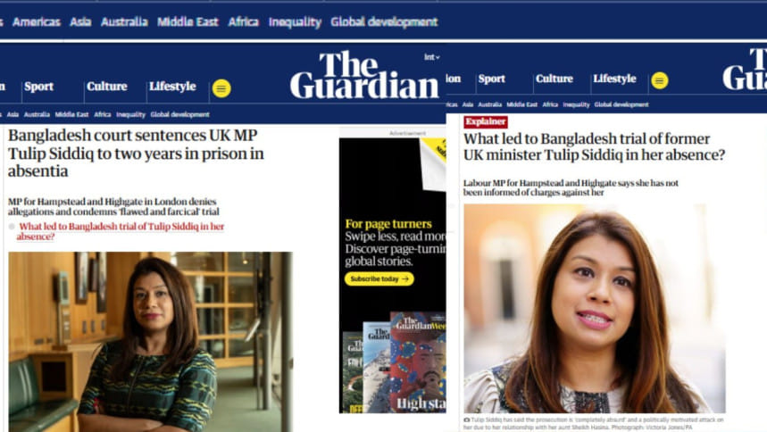 ব্রিটিশ দৈনিক দ্য গার্ডিয়ান তাদের প্রতিবেদনে উল্লেখ করেছে, বাংলাদেশের একটি আদালত দুর্নীতির অভিযোগে ব্রিটিশ এমপি টিউলিপ সিদ্দিককে তার 'অনুপস্থিতিতেই' দুই বছরের কারাদণ্ড দিয়েছেন।