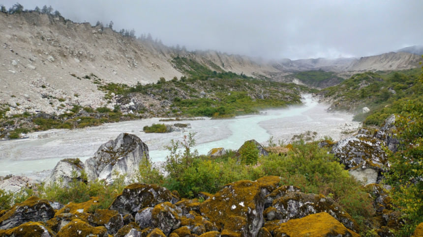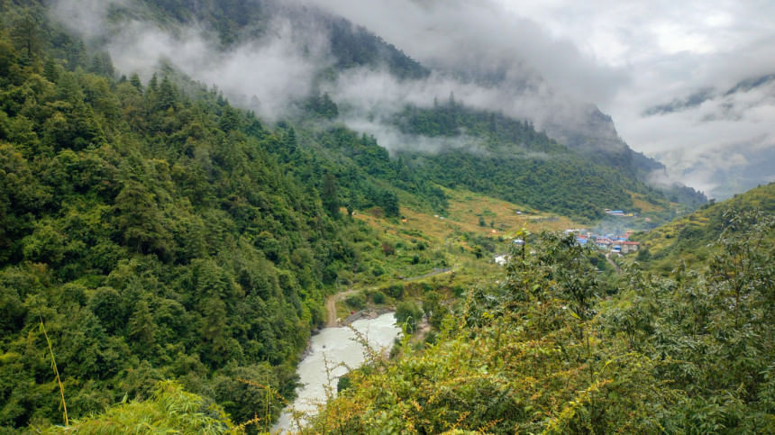 সাড়ে ৭টার দিকে হাঁটা শুরু। গ্রামের মধ্য দিয়ে পথ। এদিকেও ক্যাটারপিলারের সাহায্যে রাস্তা বানানোর কাজ চলছে। নদী আমাদের সঙ্গেই চলছে। দু-পাশে পাহাড় খাড়া হয়ে উঠে গেছে আকাশে। পাহাড়ের চূড়া দেখা যায় না মেঘের কারণে। শুধু কাঁধ অবধি দেখা যায়। দেখে মনে হয় মেঘের ওপারেই স্যার আর্থার কোনান ডয়েলের 'দ্য লস্ট ওয়ার্ল্ড'। জগতের নানান রহস্য আর আমাদের মাঝে পর্দা এই মেঘগুলো। অবগুণ্ঠন সরালেই 'হারানো পৃথিবী' খুলে যাবে চোখের সামনে।