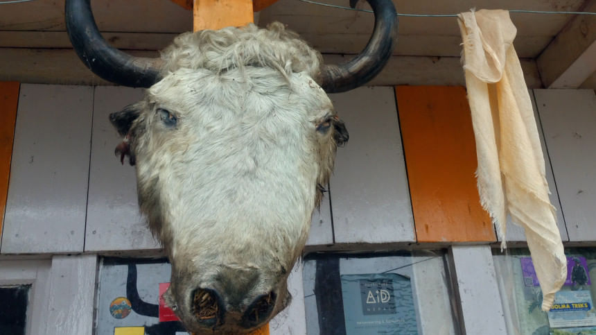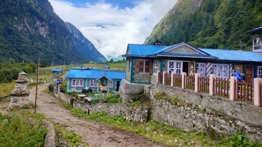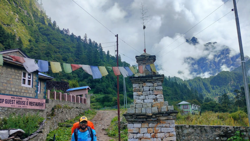 বৃষ্টি থেমে গেছে কিছুক্ষণ আগে৷ এখন পুরো চরাচরে মেঘ-কুয়াশার রাজত্ব। দৃষ্টিসীমা কুড়ি ফুটে এসে ঠেকেছে। গ্রামে প্রবেশের মুখে একটা স্তূপ। ওটা পেরিয়ে যেতেই কানে এলো ধুপধাপ শব্দ। ভালোমতো কান পাততেই বুঝলাম ভলিবল খেলার শব্দ। খেলোয়াড়ের দল ৩ হাজার ৭০০ মিটার উচ্চতায়ও থেমে নেই। অবশ্য ৪ হাজার ৬০০ মিটার উচ্চতার আমা দাবলাম বেস ক্যাম্পেও মহাসমারোহে ভলিবল ম্যাচ হতে দেখেছি। গ্রামের প্রবেশপথের প্রায় মুখেই হিমালয়ান ভিউ লজে আজকের রাত্রিবাস। ততক্ষণে সন্ধ্যা হামাগুড়ি দিয়ে প্রায় সমাগত। এই লজের নতুন বানানো ডাইনিংয়ে এখনো কাচ লাগানো হয়নি। হাওয়া খুব বেশি কামড় বসাতে পারছে না গোবরের জ্বালানি দিয়ে চালিত হিটারের কারণে।
