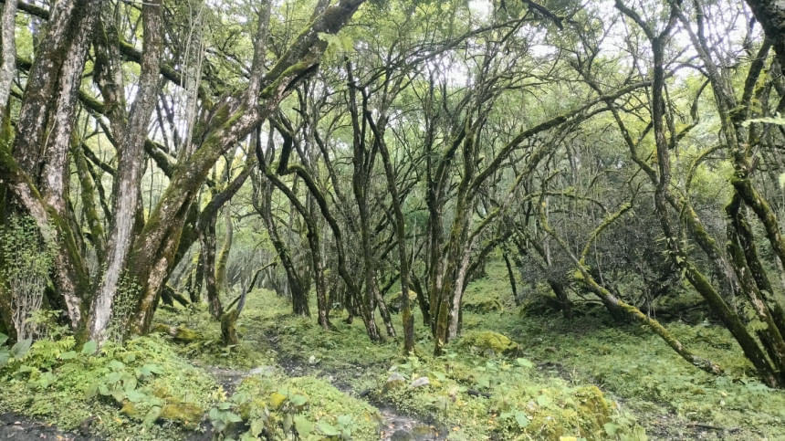 পথমধ্যে শুরু হলো ঝিরিঝিরি বৃষ্টি। এরপরেই ফের জঙ্গলের মধ্য দিয়ে পথ। কিছু জায়গায় পাথুরে সিঁড়িও আছে। সিঁড়ি দেখে তানভীর ভাই ট্রেকিং পোল চেয়ে নিলেন। সিঁড়ির অংশ শেষ হতেই কাদায় জীবন জেরবার। বকের মতো পা ফেলে ফেলে কাদা থেকে বাঁচার চেষ্টা করছি। রাস্তায় প্রচুর খচ্চর। এদের পাশ কাটাতে দিতে নানান কসরত করতে হচ্ছে। খচ্চর কিংবা চমরী গাইকে পাশ কাটাতে হলে পাহাড়ে সবসময় দেয়ালের দিকে থাকতে হয়। খাদের দিকে দাঁড়ালে বিপদের সমূহ সম্ভাবনা। এসব অবুঝ প্রাণীর মেরুদণ্ডের দুপাশে থাকা বোঝার সঙ্গে অসাবধানতাবশত লেগে গেলে খাদে পড়ে যাবার সম্ভাবনা।