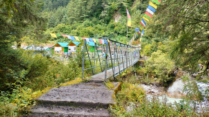 ফের পথে নেমে মূল রাস্তার বদলে আমরা চোরবাটোর পথ ধরছি। চোরবাটোর ইংরেজি প্রতিশব্দ শর্টকাট। শর্টকাটের পথে রাস্তা খাড়া হলেও দূরত্ব অনেকটুকু কমে যায়। হিমালয়ের মাল বাহকরাই মূলত এসব পথ বানায় এবং ব্যবহার করে। এখানে জঙ্গলের পথে কাদার সঙ্গে পাথরেরও আধিক্য বেড়েছে। চোরবাটোর পথ ধরে ধীর পায়ে এগিয়ে বিশাল এক ঝিরির কাছে চলে এলাম। প্রথম দিনের হাঁটাতে সবাই বেশ পরিশ্রান্ত। তানভীর ভাই আর ক্রিস বেশ খানিকটা পেছনে পড়েছে। ওরা আসতেই ফের পা চালালাম। আগের কয়েকদিনের বৃষ্টিতে এই ঝিরি রীতিমতো ফুঁসছে। সাসপেনশন ব্রিজের পাশাপাশি ঝিরির সংকীর্ণ অংশে কাঠের একটা সেতু আছে। এগিয়েই পথের ধারে সি বাকথর্নের গাছ। এই গাছের ফল থেকে বানানো জুস হিমালয়ের ট্রেকের নানান লজে বেশ জনপ্রিয়। সাদা চামড়ার লোকেরাই এর কদর করে বেশি।