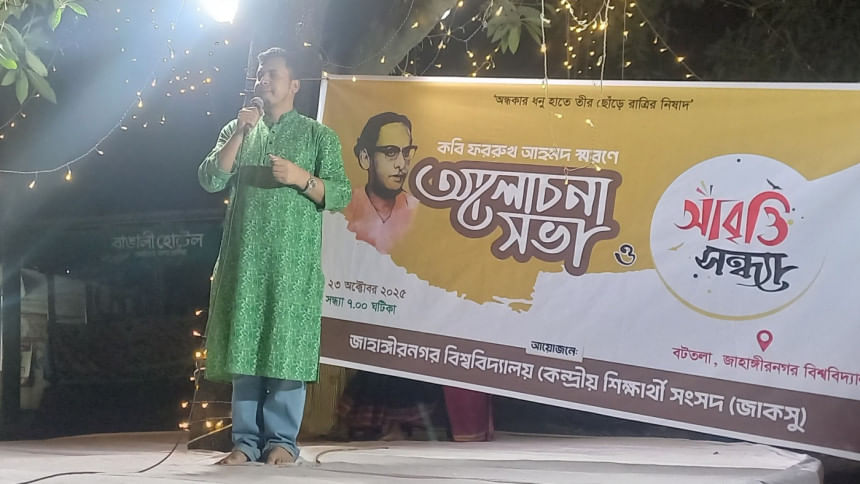 কথাগুলো বলছিলেন কবি ফররুখ আহমদের মৃত্যুবার্ষিকী উপলক্ষে জাহাঙ্গীরনগর বিশ্ববিদ্যালয় কেন্দ্রীয় শিক্ষার্থী সংসদ (জাকসু) আয়োজিত অনুষ্ঠানে প্রধান অতিথি হিসেবে ফররুখ গবেষক ড. মাহবুব হাসান।বৃহস্পতিবার রাতে বটতলায় এই আয়োজনে আরও উপস্থিত ছিলেন জাহাঙ্গীরনগর বিশ্ববিদ্যালয় কেন্দ্রীয় শিক্ষার্থী সংসদ (জাকসু)র ভিপি আব্দুর রশিদ জিতু, সাধারণ সম্পাদক মাজহারুল ইসলাম, বাংলা বিভাগের অধ্যাপক খোরশেদ আলম ও সুমন সাজ্জাদ। আলোচক হিসেবে ছিলেন গবেষক কাজল রশীদ শাহীন, মাহবুব মুকুল, বোরহান মাহমুদ, আবিদ আজম, মঈন মুনতাসীর ও ইমরান মাহফুজ। কবিতা পড়েছেন শাকিল মাহমুদ, দিদার মুহাম্মদ ও তানজিলা ফেরদৌস।