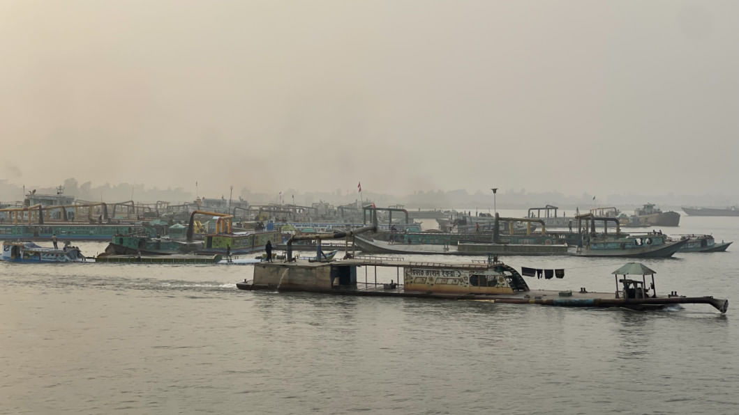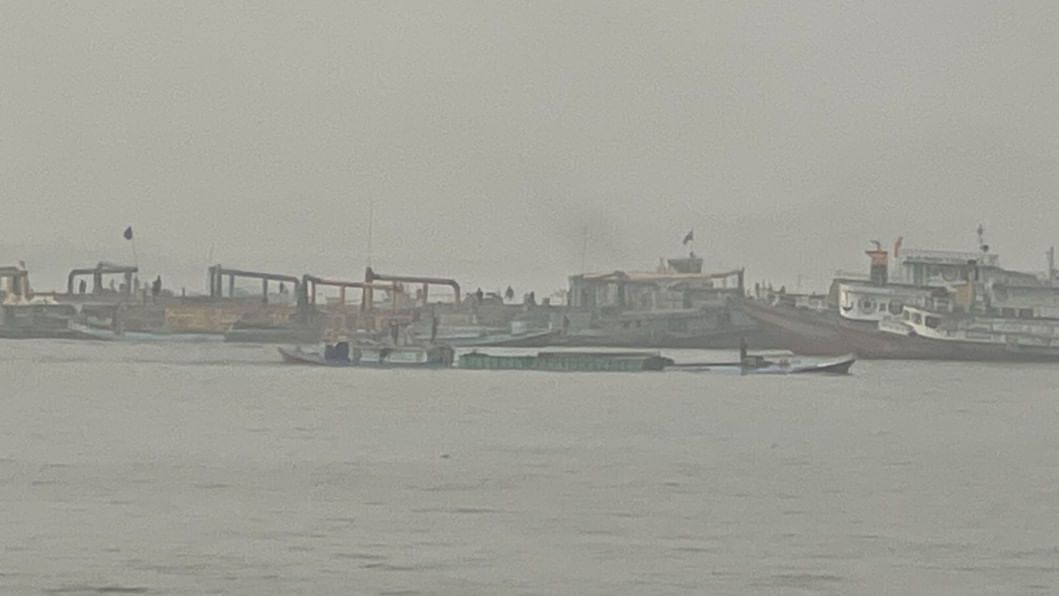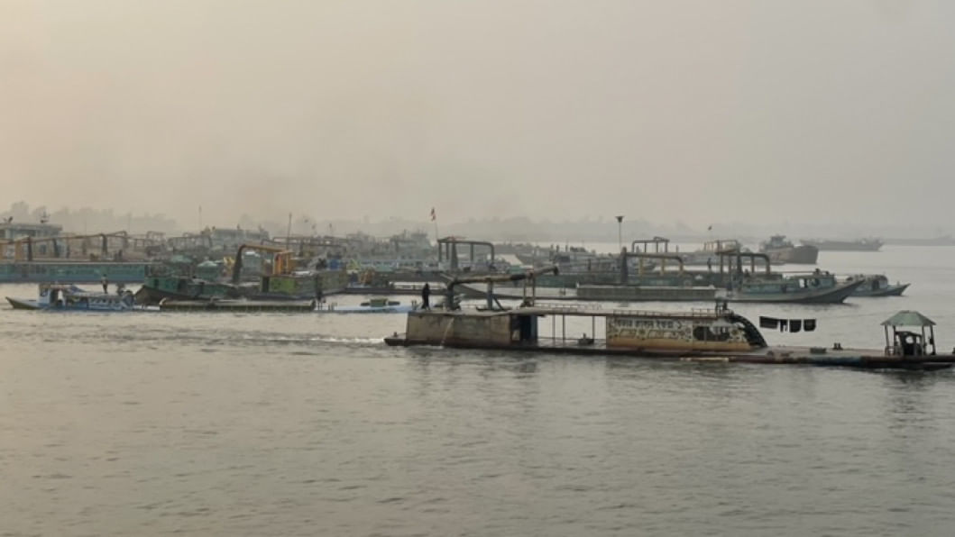 ২৩ জানুয়ারি বিকেলে মেঘনা নদীর চাঁদপুর ও মুন্সীগঞ্জ জেলার মাঝ সীমানায় দেখা যায়, সেখানে বালু উত্তোলনের মহোৎসব চলছে। ছবি: আলম পলাশ/স্টার