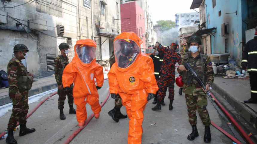 দ্য ডেইলি স্টার আজ সকাল ১১টায় সরেজমিনে দেখতে পায়, রাসায়নিক গুদামের পুড়ে যাওয়া ধ্বংসাবশেষ থেকে এখনো ধোঁয়া বের হচ্ছে।