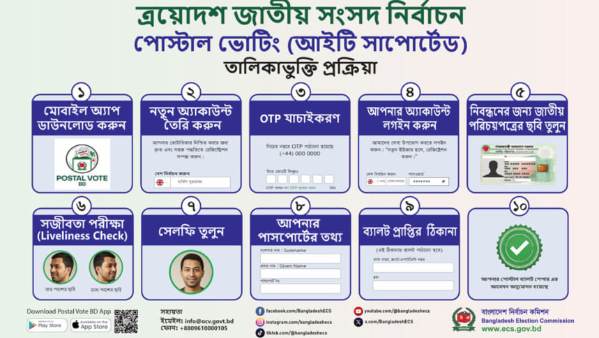 পোস্টাল ব্যালট প্রাপ্তি এবং ভোট দেওয়ার জন্য গুগল প্লে স্টোর বা অ্যাপ স্টোর থেকে পোস্টাল ভোট বিডি মোবাইল অ্যাপ ডাউনলোড ও ইনস্টল করতে হবে।