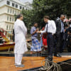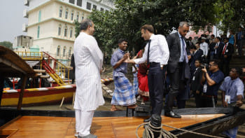 ফ্রান্সের প্রেসিডেন্ট ইমানুয়েল মাখোঁ তার দুই দিনের ঢাকা সফরে আজ সোমবার তুরাগ নদে ঘুরতে গেলে রাস্তার পাশের একজন বিক্রেতা তাকে শিঙাড়া-সমুচা-জিলাপি খাওয়ার অনুরোধ করেন। ছবি: লুডোভিক মেরিন/এএফপি