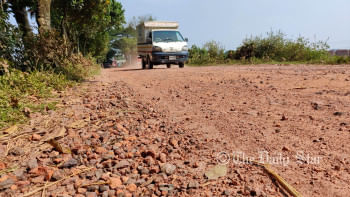 পুরো রাস্তাজুড়ে নদীর বালু ব্যবহার করা হয়েছে। রাস্তার পাশেও রাখা আছে বালু।