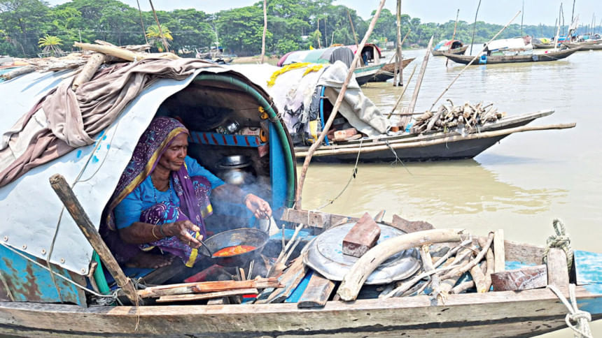 'আগে কেউ মারা গেলে আমরা লাশ পানিতে ভাসিয়ে দিতাম,' দিগন্তের দিকে তাকিয়ে বলছিলেন ৬০ বছর বয়সী কদমজান বিবি। তিনি বলেন, 'এখন চেয়ারম্যান অনুমতি দিলে আমরা স্থলে কবর দিই। আমরা পানির ওপরই জন্মাই, পানির ওপরই মরে যাই — এটাই আমাদের নিয়তি।'