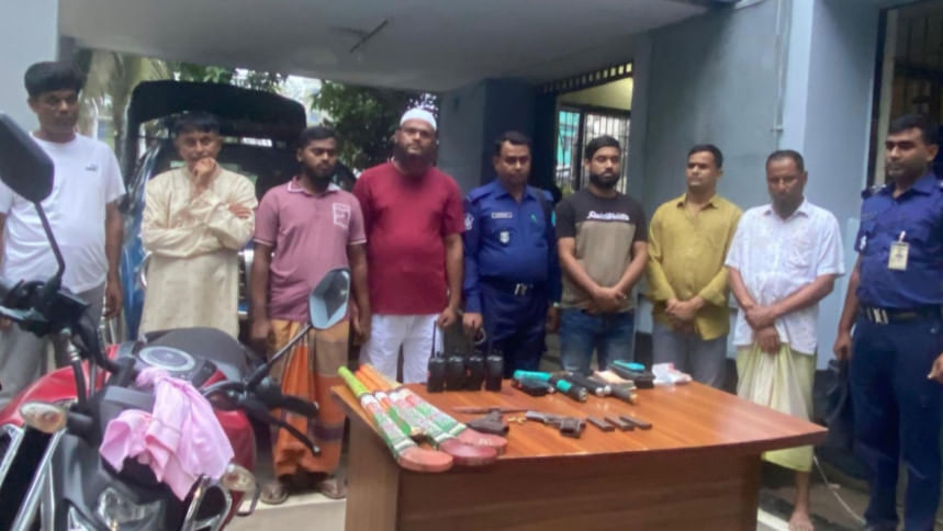 এ সময় তাদের কাছ থেকে দুটি পিস্তল, তিনটি ম্যাগাজিন, চার রাউন্ড গুলি, চারটি ওয়াকিটকি, চারটি ব্যাটন, দুটি ইলেকট্রিক শক মেশিন, একটি হ্যামার নেইল গান ও একটি চাকু উদ্ধার করা হয়।