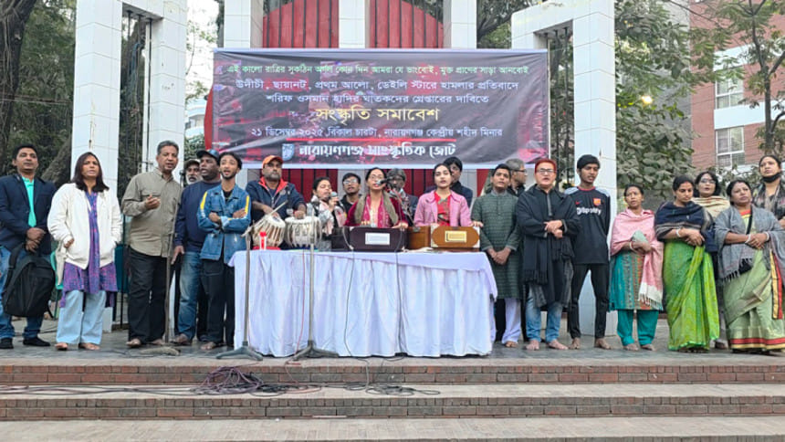 নারায়ণগঞ্জ সাংস্কৃতিক জোটের উদ্যোগে আয়োজিত এ কর্মসূচিতে উদীচী ও ছায়ানটসহ বিভিন্ন সাংস্কৃতিক সংগঠন এবং প্রথম আলো ও দ্য ডেইলি স্টারের ওপর সাম্প্রতিক হামলার প্রতিবাদে গান ও কবিতা পরিবেশন করা হয়।