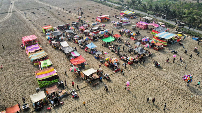একে কেন্দ্র করে মাঠের আশপাশে বসে মেলা। নাগরদোলা, চরকিতে চড়ে আনন্দে মাতেন সব বয়সী মানুষ। মাঠজুড়ে নানা পসরা নিয়ে বসেন দোকানিরা।