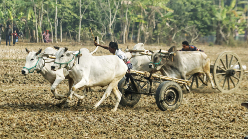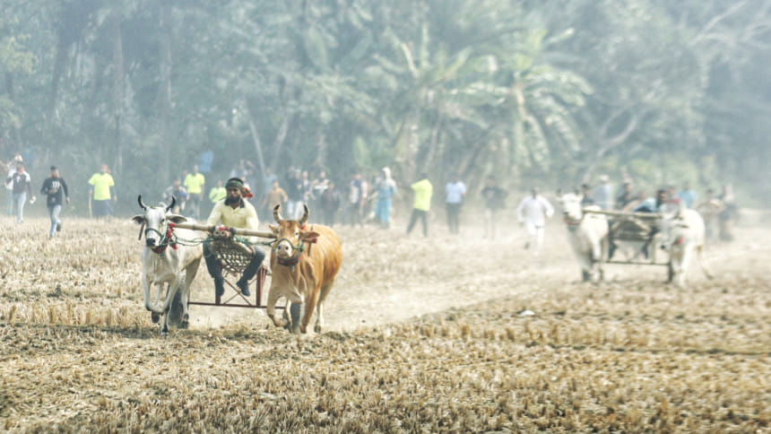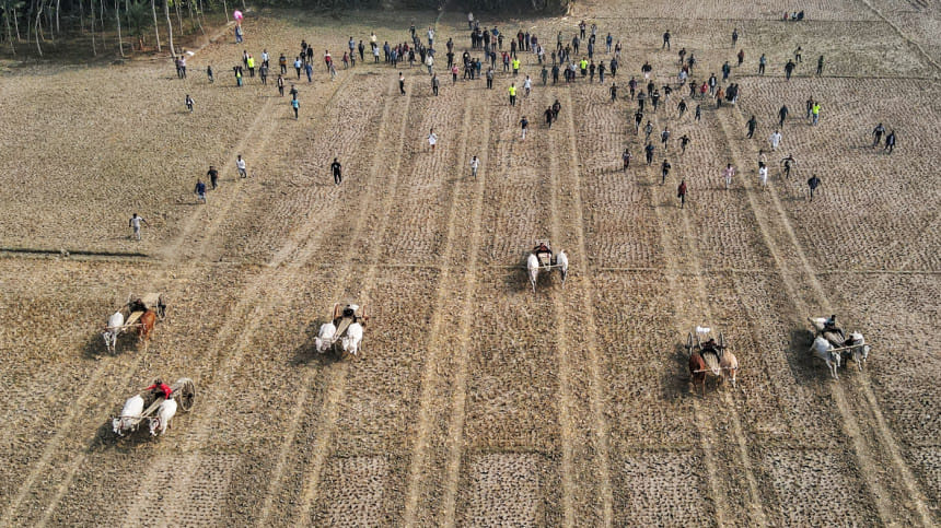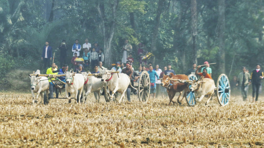 দিগন্ত বিস্তৃত মাঠের এক প্রান্ত থেকে দৌড় শুরু। গরুর পায়ের খুরের আঘাতে সদ্য ধান কাটা জমি থেকে উড়ছে ধুলো। অপর প্রান্তে পৌঁছানোর আগেই অগণিত শিশু, পুরুষ ও নারীর উল্লাসধ্বনিতে মুখরিত চারপাশ।