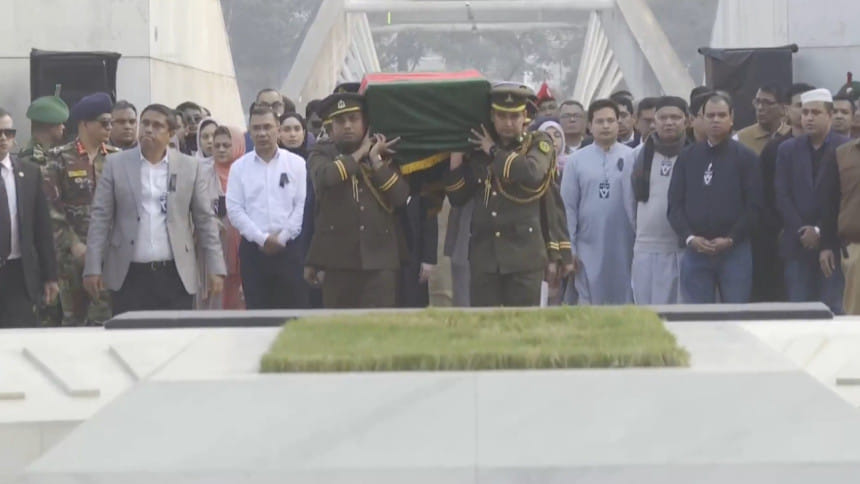 বিকেল সাড়ে ৪টার দিকে বিশেষ বাহনে করে মরদেহ নেওয়া হয় শহীদ জিয়াউর রহমানের সমাধির পাশে। সেখানে সেনা ও নৌবাহিনীর সদস্যরা কফিন কাঁধে তুলে নেন।