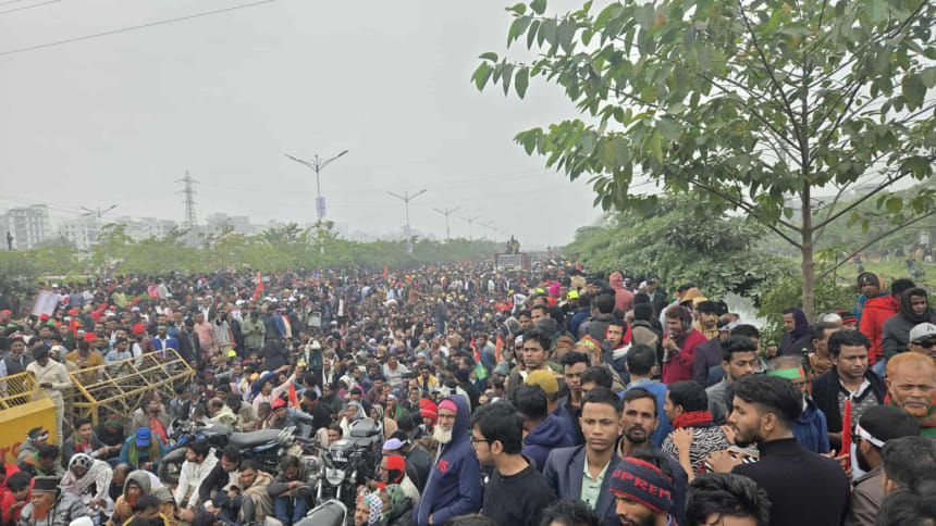আজ সকাল থেকে মঞ্চের সামনে এবং ৩০০ ফুট সড়কজুড়ে দেশের বিভিন্ন জেলা থেকে আসা নেতাকর্মীদের ভিড় বাড়তে থাকে।