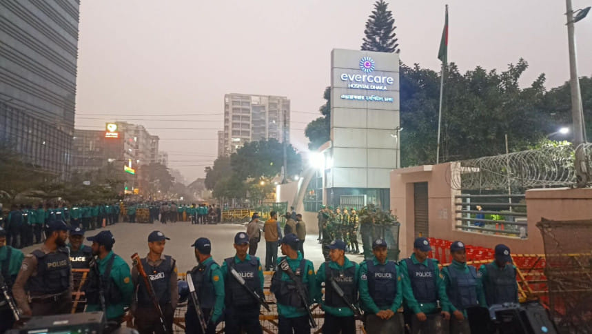 আজ দুপুর ২টার দিকে এভারকেয়ার হাসপাতালের সামনে গিয়ে দেখা যায়, হাসপাতালের বাইরে সড়কের পাশে ব্যানার হাতে দাঁড়িয়ে আছেন বিএনপির সমর্থকেরা। বাড়তি নিরাপত্তার অংশ হিসেবে হাসপাতালের সামনের সড়কে চলাচল সীমিত করা হয়েছে। শুধু রোগী ও অনুমোদিত যানবাহনকেই সেখানে প্রবেশের অনুমতি দেওয়া হচ্ছে। এ সময় সেখানে আইনশৃঙ্খলা রক্ষায় পুলিশ, বর্ডার গার্ড বাংলাদেশ (বিজিবি), আনসারসহ বিভিন্ন বাহিনীর সদস্যদের মোতায়েন থাকতে দেখা গেছে।