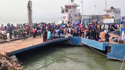 পোশাক কারখানা শ্রমিকদের ছুটির পর আজ পাটুরিয়া লঞ্চঘাটে যাত্রী চাপ বেড়েছে। ফেরিতেও যানবাহন ও যাত্রীদের চাপ বেড়েছে