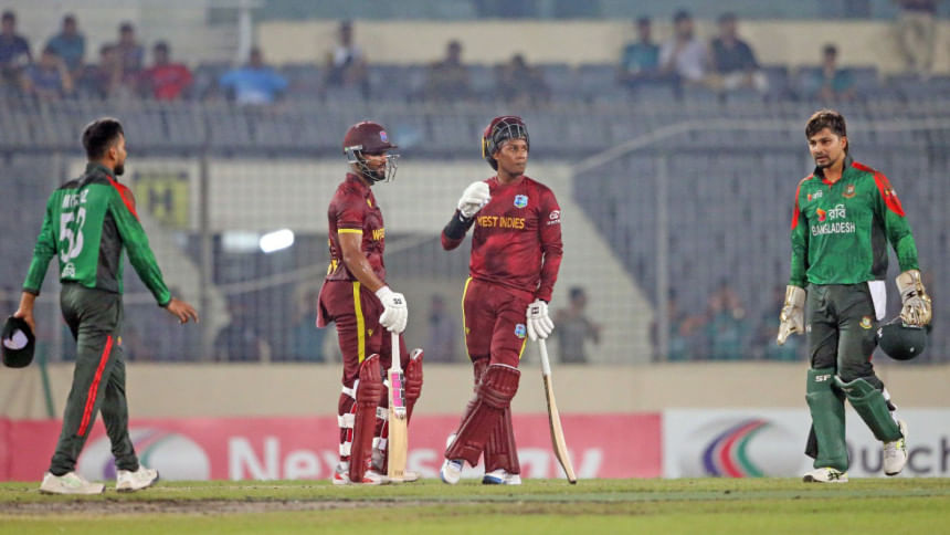 বল হাতে দুর্দান্ত সূচনা করে বাংলাদেশ। দ্বিতীয় ওভারেই নাসুম আহমেদ ফেরান ব্র্যান্ডন কিংকে। এরপর আলিক আথানাজে ও কেসি কার্টির ৫১ রানের জুটি ভাঙেন রিশাদ হোসেন, যিনি পরে কার্টিকেও ফেরান। ৫৯ বলে ৩৫ রান করেন কার্টি, ২৮ রান আথানাজের ব্যাটে। এরপর ক্রমাগত চাপ বাড়িয়ে উইকেট নেন নাসুম, রিশাদ ও তানভীর। এক পর্যায়ে ১৪১ রানে ৬ উইকেট হারিয়ে হেরে বসে ওয়েস্ট ইন্ডিজ।