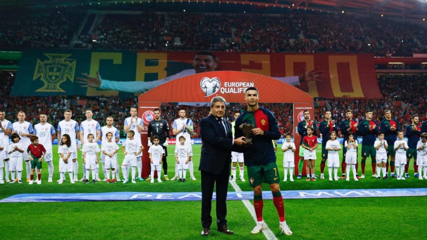 ম্যাচ শুরুর আগে রোনালদোর হাতে একটি সম্মাননা তুলে দেওয়া হয় পর্তুগালের জার্সিতে ২০০ ম্যাচ খেলার মাইলফলকের জন্য। গত জুনে প্রথম খেলোয়াড় হিসেবে ছেলেদের আন্তর্জাতিক ফুটবলে ম্যাচ খেলার 'ডাবল সেঞ্চুরি'র রেকর্ড গড়েন তিনি। সেদিন তার গোলেই আয়ারল্যান্ডের মাঠে ১-০ গোলে জিতেছিল ২০১৬ ইউরোর চ্যাম্পিয়নরা।