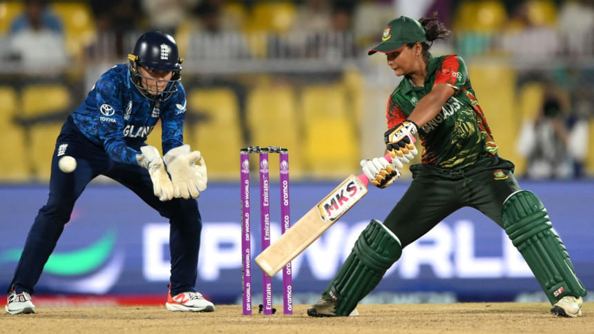২৯ বলে ২৪ রানের উদ্বোধনী জুটির পর মিড অফে ক্যাচ তুলে বিদায় নেন আগের ম্যাচের হাফসেঞ্চুরিয়ান রুবাইয়া হায়দার। জ্যোতিও এক্সট্রা কভারে ক্যাচ দিয়ে টিকতে না পারলে চাপে পড়ে যায় বাংলাদেশ। এরপর কয়েকটি জুটি আভাস দিয়েও হয়নি বড়। নিয়মিত বিরতিতে উইকেট পড়ায় রানের চাকা ধীরগতির হয়ে পড়ে।