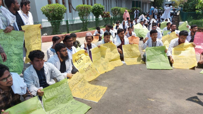 নিরাপদ হলের দাবিতে শের-ই-বাংলা মেডিকেল কলেজ (শেবাচিম) অধ্যক্ষ কার্যালয় ঘেরাও করেছেন শিক্ষার্থীরা।