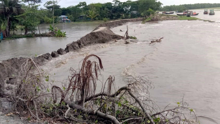 পাঁচ সদস্যের পরিবার নিয়ে পটুয়াখালীর কলাপাড়ার রাবনাবাদ নদীর আধা বিধ্বস্ত বেড়িবাঁধের ওপর বসতি গড়েছিলেন মৎস্যজীবী জাহাঙ্গীর শিকদার। ঘূর্ণিঝড় অশনির প্রভাবে অস্বাভাবিক জোয়ারে বাঁধটির প্রায় ৫০০ ফুট অংশ...