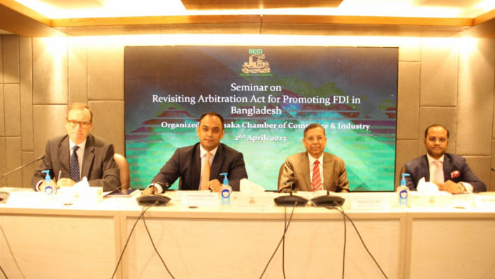 ডিসিসিআই অডিটোরিয়ামে আয়োজিত ‘বাংলাদেশে বৈদেশিক বিনিয়োগ আকর্ষণে আরবিট্রেশন আইনের প্রয়োজনীয় সংস্কার’ শীর্ষক সেমিনারে ডিসিসিআই এ কথা বলে।