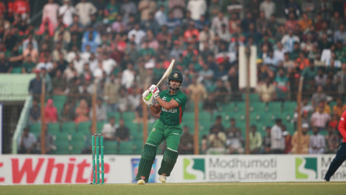 মাত্র ২৭ বলে টানা দ্বিতীয় ও টি-টোয়েন্টি ক্যারিয়ারে সব মিলিয়ে তৃতীয় ফিফটি স্পর্শ করেন শান্ত। তার আগ্রাসন থামে ইংলিশ পেসার মার্ক উডের গতিময় বলে।