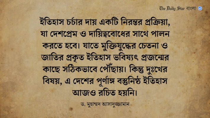 ইতিহাসচর্চার দায় একটি নিরন্তর প্রক্রিয়া, যা দেশপ্রেম ও দায়িত্ববোধের সাথে পালন করতে হবে। যাতে মুক্তিযুদ্ধের চেতনা ও জাতির প্রকৃত ইতিহাস ভবিষ্যৎ প্রজন্মের কাছে সঠিকভাবে পৌঁছায়। কিন্তু দুঃখের বিষয়, এ...