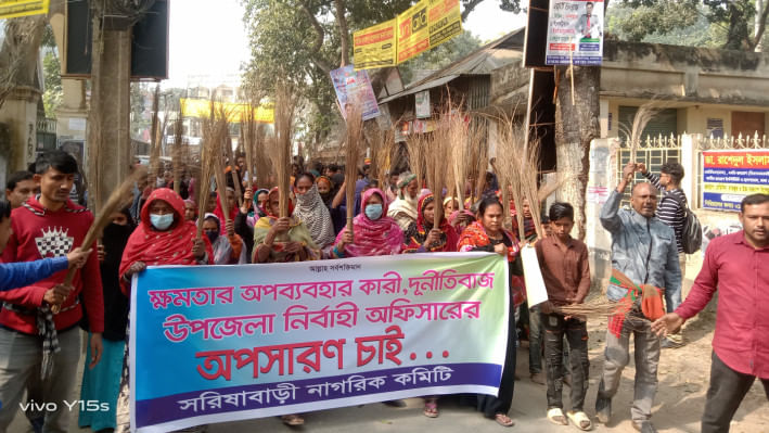 জামালপুরের সরিষাবাড়ীর উপজেলা নির্বাহী কর্মকর্তা (ইউএনও) উপমা ফারিসার অপসারণের দাবিতে ঝাড়ু মিছিল, বিক্ষোভ সমাবেশ ও মানবন্ধন কর্মসূচি অনুষ্ঠিত হয়েছে।