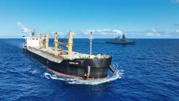 ইতালির নৌ-বাহিনীর একটি ফ্রিগেট জাহাজটিকে পাহারা দিয়ে নিয়ে যাচ্ছে।