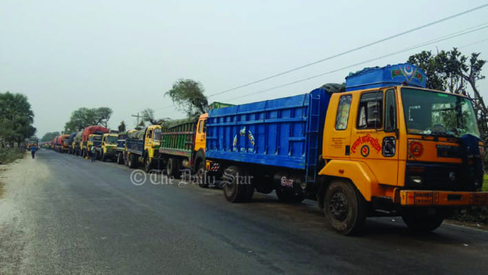 ঘন কুয়াশায় কাজিরহাট-আরিচা রুটে ফেরি চলাচল বিঘ্ন, পারাপারের অপেক্ষায় ৩-৪ শতাধিক ট্রাক।
