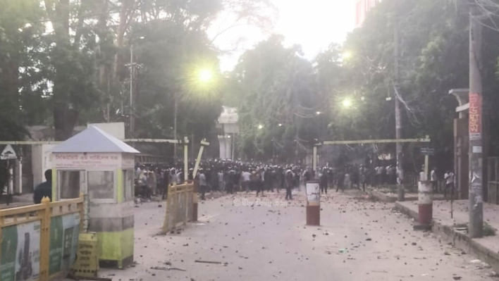 শহীদুল্লাহ হল ও কার্জন হলে অবস্থানরত শিক্ষার্থীরা ছাত্রলীগকে লক্ষ্য করে ইট ছোড়ে।