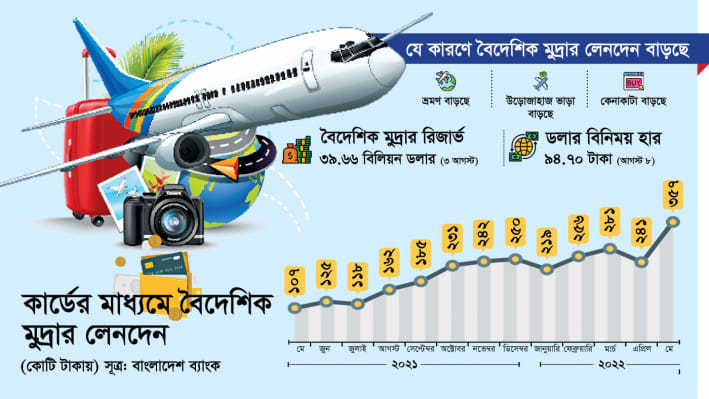 বিদেশে ভ্রমণ বেড়ে যাওয়ায় গত মে মাসে কার্ডের মাধ্যমে বৈদেশিক মুদ্রার লেনদেন হয়েছে ৩৫৬ কোটি টাকা, যা এ যাবতকালের মধ্যে সর্বোচ্চ।