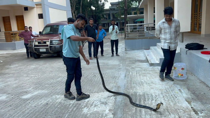 চট্টগ্রামের নাজিরহাটের ঝংকার এলাকায় সাপুড়ের কাছ থেকে বিপন্ন প্রজাতির একটি রাজ গোখরা বা কিং কোবরা সাপ উদ্ধার করেছে বন বিভাগ।