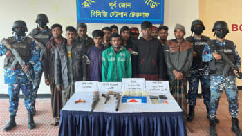 কক্সবাজারের টেকনাফে ১৪টি আগ্নেয়াস্ত্র, ৪৮৬ রাউন্ড গোলাবারুদ, ২০ হাজার পিস ইয়াবাসহ ডাকাতদলের সদস্য ৬ রোহিঙ্গাকে আটক করেছে কোস্টগার্ড।