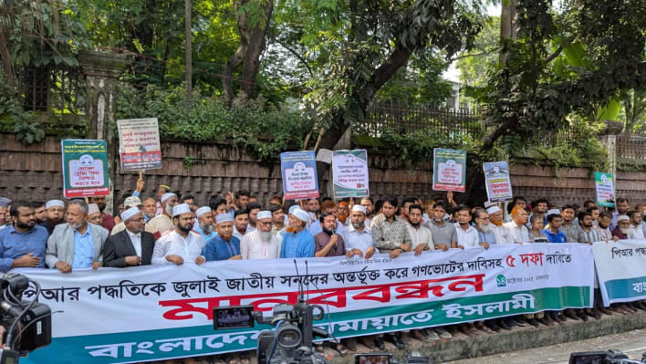 গণভোটের মাধ্যমে জুলাই সনদের আইনি ভিত্তি দিয়ে আগামী ফেব্রুয়ারিতে জাতীয় নির্বাচন আয়োজন করাসহ প্রায় অভিন্ন কয়েকটি দাবিতে যুগপৎ আন্দোলনে থাকা জামায়াত ও ইসলামী আন্দোলনসহ সাতটি রাজনৈতিক দলের মানববন্ধন...