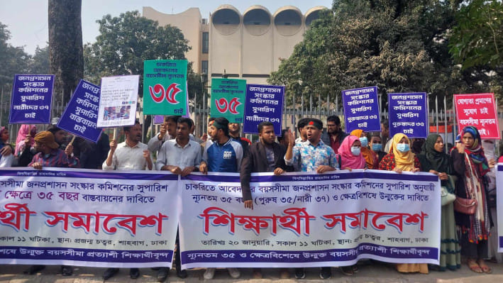 চাকরিতে প্রবেশের বয়সসীমা ৩০ বছর থেকে বাড়িয়ে ৩৫ বছর করার দাবিতে আন্দোলনকারীদের ছত্রভঙ্গ করতে পুলিশ টিয়ারগ্যাস ব্যবহার করে।