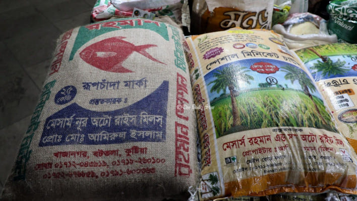 বস্তার ওপর মিলের নাম, উৎপাদনের তারিখ, ধান-চালের জাত লিখা থাকলেও, দাম লিখা নেই।