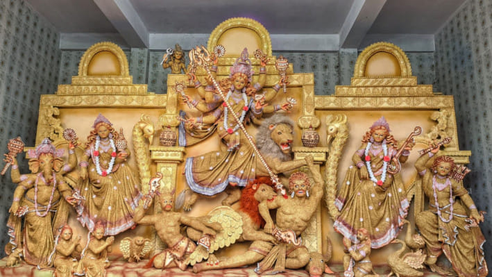 দুর্গাপূজা শুরু হবে আগামীকাল শুক্রবার থেকে। তার আগেই ধান দিয়ে তৈরি শৈল্পিক কারুকাজে নির্মিত প্রতিমা দেখতে ভিড় করছে অনেকে।