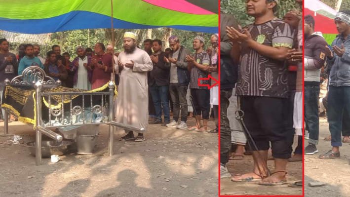 পটুয়াখালীর মির্জাগঞ্জে প্যারোলে মুক্তি পেয়ে পায়ে ডান্ডাবেড়ি পরা অবস্থায় বাবার জানাজায় অংশ নিলেন এক ছাত্রদল নেতা।