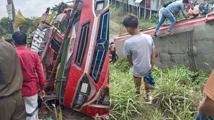 ইলিশ পরিবহনের বাসটি মহাসড়কের পাশের ডোবায় পড়ে যায়। শ্যামলী পরিবহনের বাসটি মহাসড়কের পাশে গাছের সঙ্গে ধাক্কা লেগে দুমড়ে-মুচড়ে যায়।