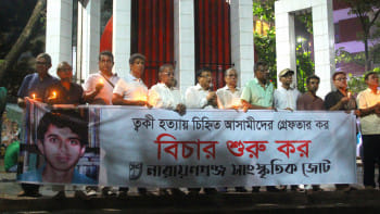 দীর্ঘ ১১ বছরেও নারায়ণগঞ্জের মেধাবী কিশোর তানভীর মুহাম্মদ ত্বকী হত্যার বিচার শুরু না হওয়ায় ক্ষোভ প্রকাশ করে বক্তারা বলেছেন, ‘বিচার বিলম্বিত করা মানে ন্যায়বিচারকে অস্বীকার করা। ত্বকী এখন বিচারহীনতার...