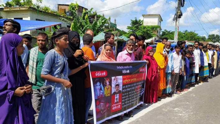 মানিকগঞ্জের ঘিওরে নববধূ সুমি হত্যার ঘটনায় দোষীদের শাস্তির দাবিতে ঢাকা-আরিচা মহাসড়কে মানববন্ধন করেছেন নিহতের স্বজন ও এলাকাবাসী।