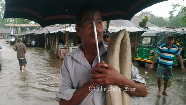 বন্যার পানিতে তলিয়ে গেছে বাজার। ছাতা মাথায় পানিতে দাঁড়িয়ে ক্রেতার অপেক্ষা করছিলেন ষাটোর্ধ্ব পাটি কারিগর নিরেন্দ্র কুমার দাস। পাটি বিক্রি করে তার সংসার চলে। কিন্তু, দীর্ঘক্ষণ দাঁড়িয়ে থেকেও কোনো...