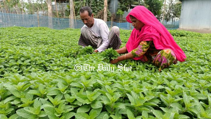 বাণিজ্যিকভাবে পুদিনাপাতা চাষে স্বাবলম্বী হয়েছেন লালমনিরহাটের সীমান্তবর্তী মোগলহাট ইউনিয়নের কর্ণপুর গ্রামের কৃষকদম্পতি রুহুল আমিন বাবু এবং আনোয়ারা বেগম।