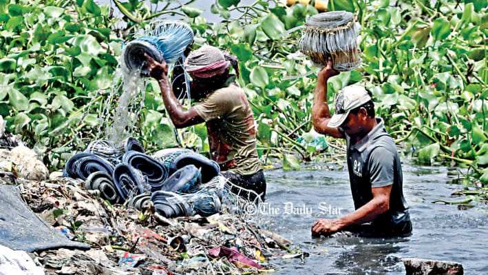 রাজধানীর পোস্তগোলা শ্মশানঘাট সংলগ্ন বুড়িগঙ্গা নদীর নোংরা পানিতে গাড়ির এয়ার ফিল্টার, টায়ার ও ব্যাটারি ধুচ্ছেন ২ ব্যক্তি। এগুলো ধুয়ে, গলিয়ে কাছাকাছি ভাঙারির দোকানগুলোতে বিক্রি করা হয়।