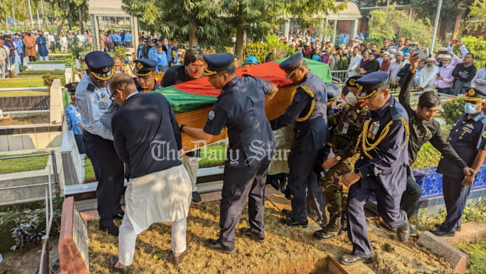 রাজধানীর বনানী কবরস্থানে রাষ্ট্রীয় ও সামরিক মর্যাদায় চিরনিদ্রায় শায়িত হলেন অপারেশন কিলো ফ্লাইটের বৈমানিক ও মুক্তিযোদ্ধা গ্রুপ ক্যাপ্টেন (অব.) শামসুল আলম বীর উত্তম।